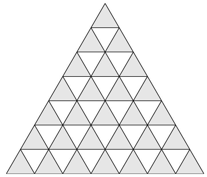 answer:## Solution.Let's prove that the answer is n(n+1).Let a segment denote a length of 1.With each side of the original triangle, there are1+2+cdots+n=frac{n(n+1)}{2}segments.If we color all n(n+1) segments that are parallel to one of the two sides of the original triangle, then there does not exist an equilateral triangle with all three red sides.We still need to prove that we cannot color more than n(n+1) segments without forming an equilateral triangle with three red sides.Let's shade the triangles whose vertex opposite to the side parallel to the bottom side of the original triangle is pointing upwards, as shown in the figure. The bases of these triangles are segments parallel to the bottom side of the triangle, so there are frac{1}{2} n(n+1) such triangles.No two of these triangles share a side. If more than n(n+1) segments were colored red, then by the Pigeonhole Principle, at least one of the shaded triangles would have all three sides colored red. Therefore, n(n+1) is the maximum number of segments that can be colored red.